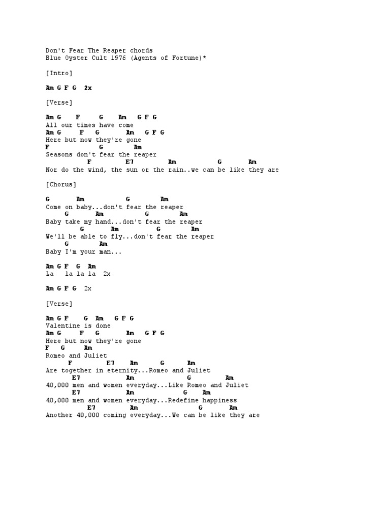 Don T Fear The Reaper Sheet Music Blue Oyster Cult Guitar Chords Lyrics